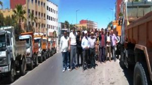 دخل مهنيو شاحنات نقل مواد البناء المنضويين تحت لواء نقابة الاتحاد العام للشغالين بالمغرب ابتداء من اليوم 07يونيو 2018 في إضراب محلي مفتوح ، حيث اصطفت معظم الشاحنات بشارع المغرب العربي بتاوريرت معلقة عليها أوراق مكتوب عليها (للبـــيع : اعتبارا للبطالة المطلقة ، توقيف رخص البناء ، محاصرتي من طرف الشركات الكبرى ، قررت وضع شاحنتي للبيع مما سيتسبب في تشريد عائلتي ) (التفاصيل….) →