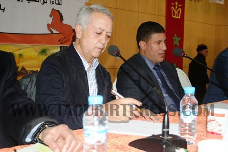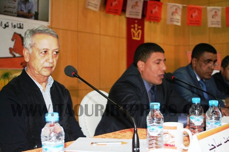 في البداية وبعد الوقوف والاستماع لنغمات النشيد الوطني تناول الكلمة السيد محمد الصغير ناصر الكاتب الإقليمي للحزب أكد فيها على أن هذا اللقاء يأتي كحلقة ضمن سلسلة اللقاءات التواصلية التي يقوم بها الحزب بمختلف الأقاليم والجهات لإبراز مكانته السياسية ومن اجل المساهمة في تأطير مناضليه وتأطير المواطنين والاستماع الى مطالبهم في إطار المقاربة التشاركية و التسيير الجماعي وتكريس مبادئ الحكامة والديموقراطية . مع التأكيد على ضرورة تجديد البرامج وتطوير العمل السياسي في إطار اللامركزية واللاتمركز ليصبح بوثقة تتبلور فيه العبقرية المحلية لتحقيق الجهوية الموسعة في ظل السيادة الوظنية واستعدادا للاستحقاقات الانتخابية المقبلة التي ستشكل لا محالة مرحلة حاسمة . وأضاف السيد الكاتب الإقليمي مخاطبا الحضور استعداده للتواجد إلى جانبهم في إطار سياسة القرب ولحل ما أمكن حله ومعايشة همومهم وانشغالاتهم مشيرا إلى أن الحزب لا يزال يمارس دوره من خلال انشغال قيادييه ومنتخبيه بحمل هموم هذا الإقليم إلى البرلمان والحكومة عن طريق السيد ناصر محمد الممثل البرلماني . وختم الكاتب الإقليمي كلمته بتجديد التأكيد على أن الحزب سيواصل درب النضال رغم ما يعرفه ويتلقاه من مضايقات واستفزازات من جهات حزبية أخرى تحاول تقزيم حجمه و الحد من توسعه .