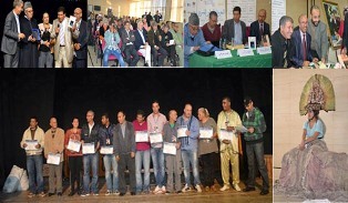 لحظات التكريم: لحظات باهرة لم تغادرها العين أعادت الحضور إلى البدايات الجنينية للمسرح والنضال النقابي بمدينة وجدة في حضرة الأستاذ الدكتور محمد حرفي المحتفى به هذه الدورة الرجل الذي يعيش داخل جغرافية ثقافية ونقابية لا حدود لها تتلاءم مع أسئلته و قلقه وأحلامه وشغفه الدائم بالكتابة والعمل الجمعوي الإنساني لحظات اهتزت لها القاعة بالتصفيقات ووقف لها الجميع تحية واحتراما لهذا الرجل الذي امن وعمل بصمت بعيدا عن أجندة الإعلام المغربي وكما جاء على لسان الدكتور مصطفى رمضاني سوف تظل الكلمات عاجزة في هذا المقام عن منح هذا الرجل المناضل من العيار الثقيل ما يستحق من الثناء والتقدير كما استحضر الأستاذ والمخرج المسرحي يحي بودلال عمدة المسرح العمالي بوجدة مجموعة من المواصفات والمبادئ التي ميزت المسار النضالي والثقافي للسيد المحتفى به محمد حرفي وخلال مراسيم حفل الإفتتاح هذه وفي جو تطبعه الحميمية والإخاء سلمت الهدايا ودرع المهرجان للسيد المحتفى به محمد حرفي