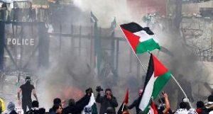 وحمل المتظاهرون أعلاما فلسطينية وارتدوا الكوفية، مطلقين هتافات ضد ترامب الذي اعترف الأربعاء بالقدس عاصمة لاسرائيل.