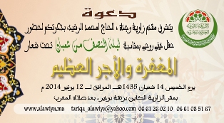 تنظم الطريقة الصوفية العلوية المغربية بزاويتها بمدينة وجدة الكائنة بزنقة بودير الاحتفال السنوي بليلة النصف من شعبان يوم الخميس 14 شعبان 1435هـ الموافق لـ 12 يونيو 2014 م بعد صلاة المغرب، تحت شعار ” المغفرة والأجر العظيم “.