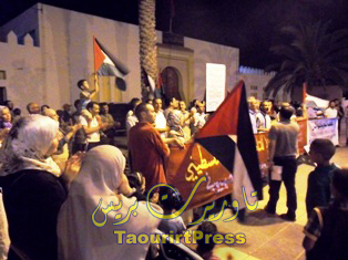 نظمت الجمعية المغربية لحقوق الإنسان فرع تاوريرت أمس الجمعة 11 يوليوز 2014 على الساعة العاشرة ليلا أمام مقر المحكمة الابتدائية بتاوريرت وقفة تضامنية مع الشعب الفلسطيني الصامد تنديدا بالعدوان الإسرائيلي المتواصل على قطاع غزة . رفعت خلالها الأعلام الفلسطينية ويافطات كتبت عليها شعارات التضامن اللامشروط مع الشعب الفلسطيني .