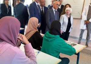 وقامت يلين رفقة وزير التربية الوطنية والتعليم الأولي والرياضة، شكيب بنموسى، بجولة في مدرسة بن يوسف الثانوية في مراكش، التي خصصت لاستقبال التلاميذ المتضررين من الزلزال بعد تعرض مدارسهم للهدم الكلي أو الجزئي.