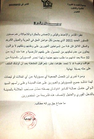 كما طالب المحتجون من خلال شعارتهم ( كولو للوالي مطالبنا قانونية لا تسويف لا وعود لا حلول ترقيعية ) السيد الوالي لفك معظلتهم التي دامت أكثر من 32 سنة و في هذا الصدد أصدرت الجمعية بيانا و هذا نصه :