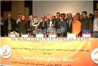في إطار أنشطتها الحزبية قامت الكتابة الإقليمية لحزب الاتحاد الدستوري بتاوريرت بشراكة مع منظمة المرأة الدستورية صباح يوم 14 مارس 2015 رفقة البرلمانية فوزية لبيض وأعضاء المكتب الوطني لمنظمة المرأة الدستورية بزيارة ميدانية إلى جناح الولادات بالمستشفى الإقليمي بتاوريرت ومنه تم التوجه نحو القرية الصناعية ثم دار الإيواء ودار العجزة.وخلال الفترة المسائية و وفقا لبرنامج اللقاء التواصلي الذي تم تنظيمه تحت شعار ” مشاركة المرأة في الحياة السياسية ” بقاعة المركب الاجتماعي مولاي علي الشريف .