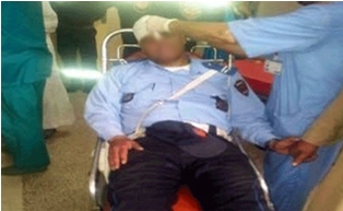 وعلى الرغم من محاولة تهدئته لترك السلاح الأبيض، الذي كان قد أشهره في وجه العناصر الأمنية إلا أن الخمر أثر عليه، وبدا في حالة هستيرية، حيث بدأ في التلويح بالسكين في كل الاتجاهات، وعند اتخاذ رجال الشرطة قرار الاقتراب لاقناعه بوضع السكين جانبا فوجئوا به يوجه ضربة بمديته نحو الشرطي الضحية التي اتت على جزء من أذنه اليسرى، وواصل الاعتداء ليصيب شرطيا ثانيا بجرح خطير، وهو ما تطلب استقدام سيارة إسعاف نقلتهما على وجه السرعة إلى قسم المستعجلات في المدينة.