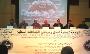 نظمت الجامعة الوطنية لعمال و موظفي الجماعات المحلية (الاتحاد المغربي للشغل ) أمس السبت 19 دجنبر 2015 ابتداء من الساعة الثالثة بعد الزوال بقاعة المركب الاجتماعي مولاي علي الشريف المؤتمر الاقليمي الاول ( جهة الشرق ) تحت شعار ” تنمية الجماعات الترابية رهين بتحسين الاوضاع المادية والمعنوية للشغيلة الجماعية . اطره كل من الكاتب الوطني سعيد الشاوي حول مستجدات الملف المطلبي حيث اكد ان ملف عمال النظافة سيكون من ضمن اولويات الجامعة في المؤتمر الوطني للجامعة الدي سيحدد موعده بعد انعقاد المجلس الوطني الدي سينعقد في 9 يناير