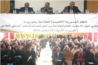 احتضنت قاعة المركب الاجتماعي ” مولاي علي الشريف ” بتاوريرت صباح اليوم 23/12/2015 يوما إخباريا حول السجل الوطني الفلاحي، نظمته المديرية الإقليمية للفلاحة ، و أطره كل من السيد رجميل حسن المدير الإقليمي للمديرية والسيد بنحفون محمد رئيس مصلحة الإحصاء بحضور رئيس المجلس الاقليمي حميدة محجوبي .